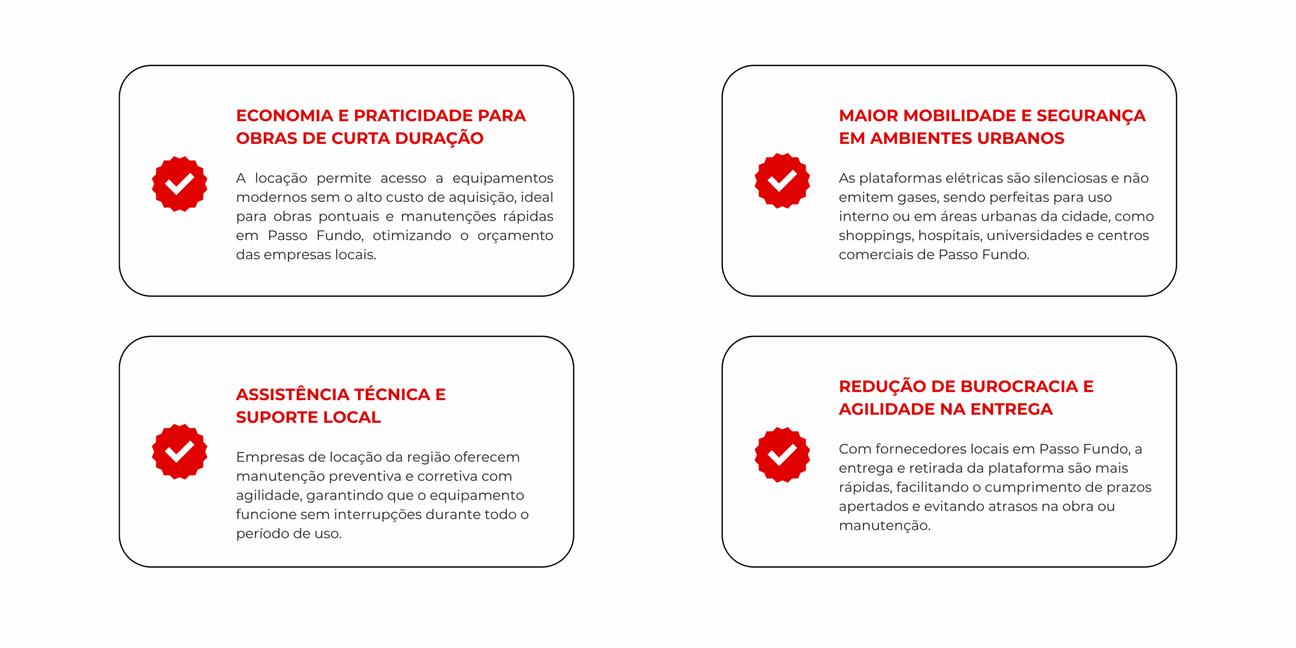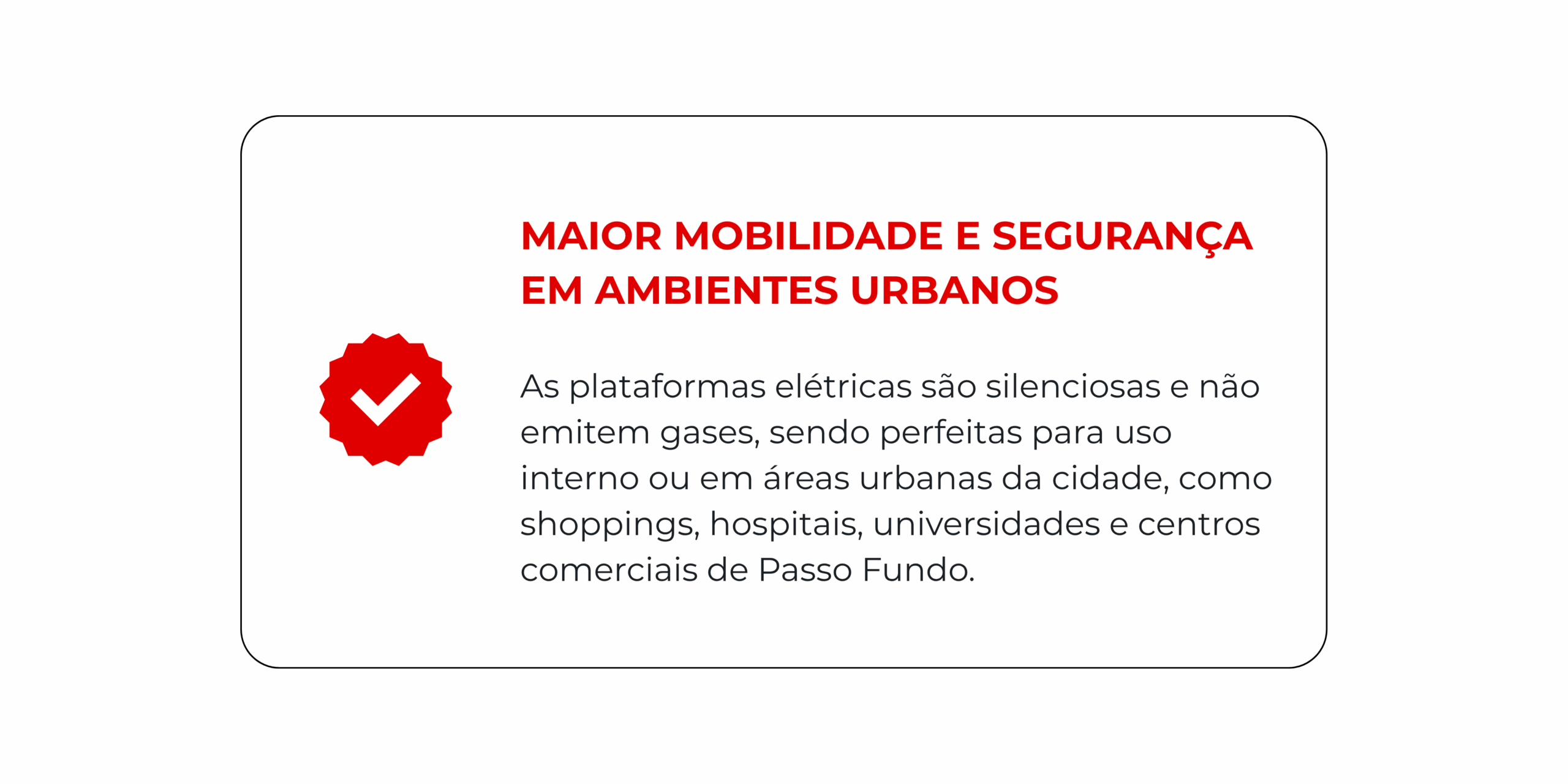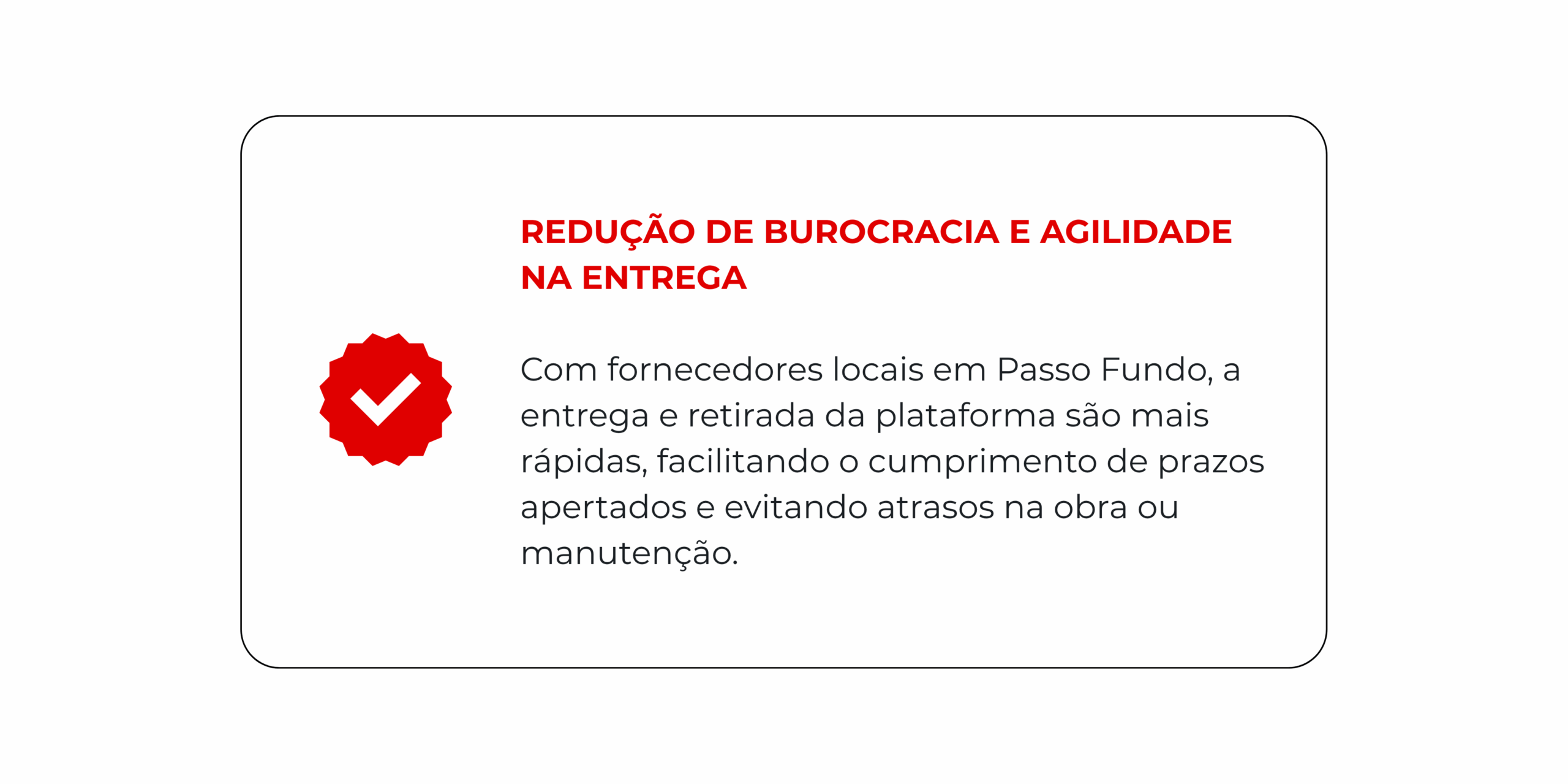 Somos uma empresa de Passo Fundo–RS especializada na locação de plataformas elevatórias elétricas de até 12 metros. Trabalhamos com equipamentos novos, transporte próprio e atendimento com horários flexíveis. Atendemos com agilidade, segurança e as melhores condições comerciais. Facilidade na negociação e eficiência são os nossos diferenciais.